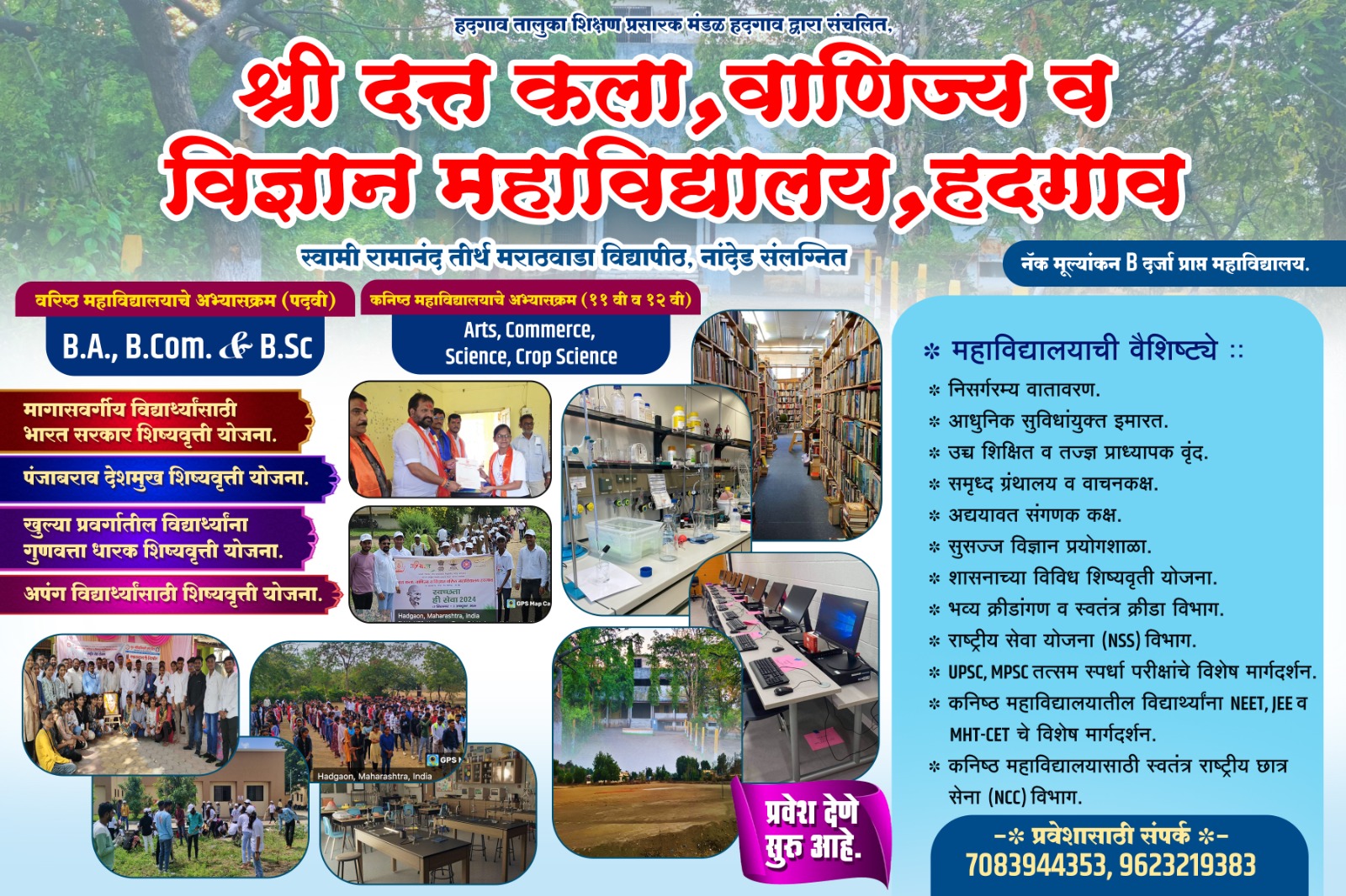 A) हदगाव तालुका शिक्षण प्रसारक मंडळ संचलित श्री दत्त कला, वाणिज्य व विज्ञान महाविद्यालय, हदगांव येथे आम्ही गरीब, वंचित आणि दुर्लक्षित घटकांपर्यंत पोहोचण्यासाठी वचनबद्ध आहोत. त्यांच्या धैर्यास बळ देणे, त्यांच्यातील आत्मविश्वास जागृत करणे आणि त्यांना त्यांच्या व्यक्तिमत्त्वाचा समग्र विकास साधता येईल अशी संधी निर्माण करणे हे आमचे ध्येय आहे. यामुळे ते उच्च शिक्षण हा त्यांचा नैसर्गिक हक्क म्हणून मागणी करू शकतील. दृष्टीक्षेप हदगाव तालुका शिक्षण प्रसारक मंडळ राष्ट्रीय एकात्मतेच्या आदर्शाना बांधील राहून, ज्ञान, प्रशिक्षण आणि कौशल्याच्या संधी उपलब्ध करून देऊन प्रत्येक नागरिकात, विशेषतः ग्रामीण आणि आदिवासी समाजातील वंचित आणि दुर्लक्षित व्यक्तीमध्ये स्वाभिमान निर्माण करण्याच्या दृष्टिकोनातून कार्यरत आहे.